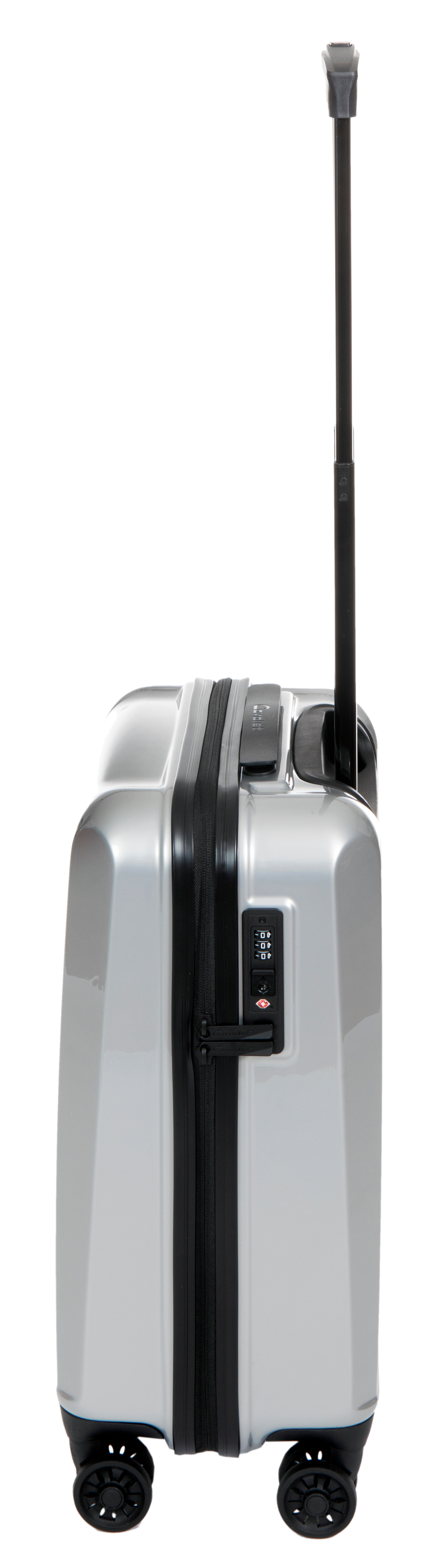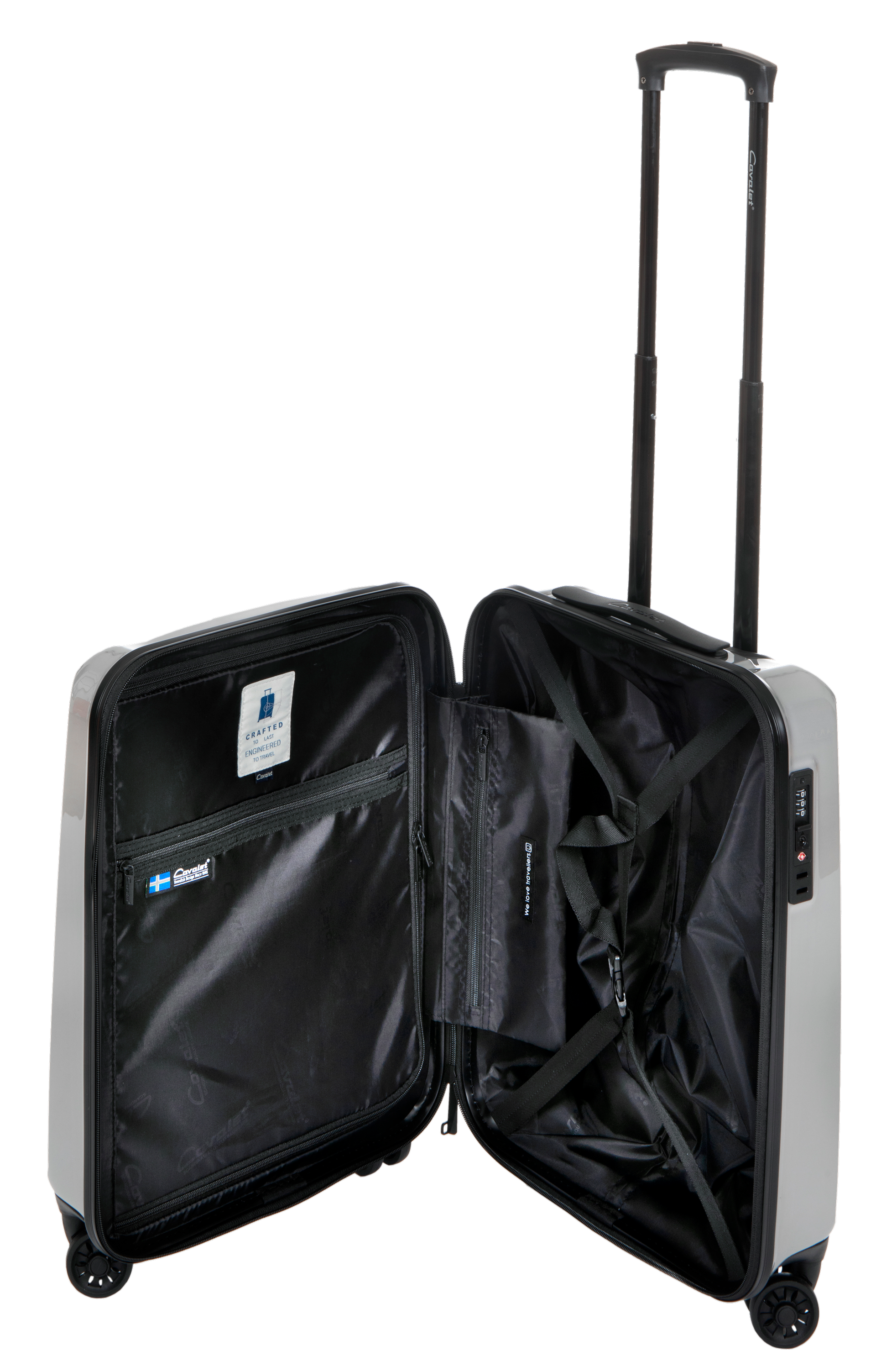 Försänkt fast TSA-lås. Avdelare med nätficka. Säkerhetsficka. Band i både locket och bottenfacket. Integrerat teleskop handtag.
