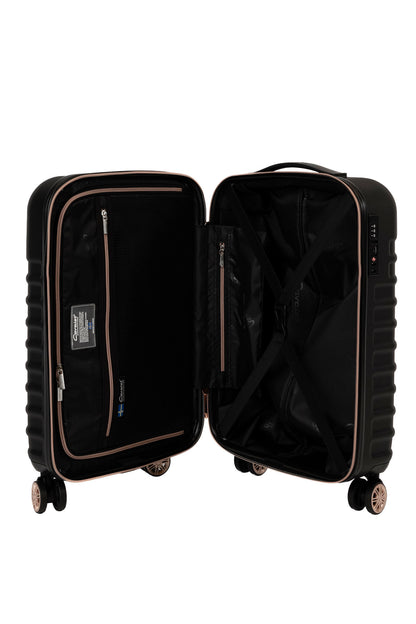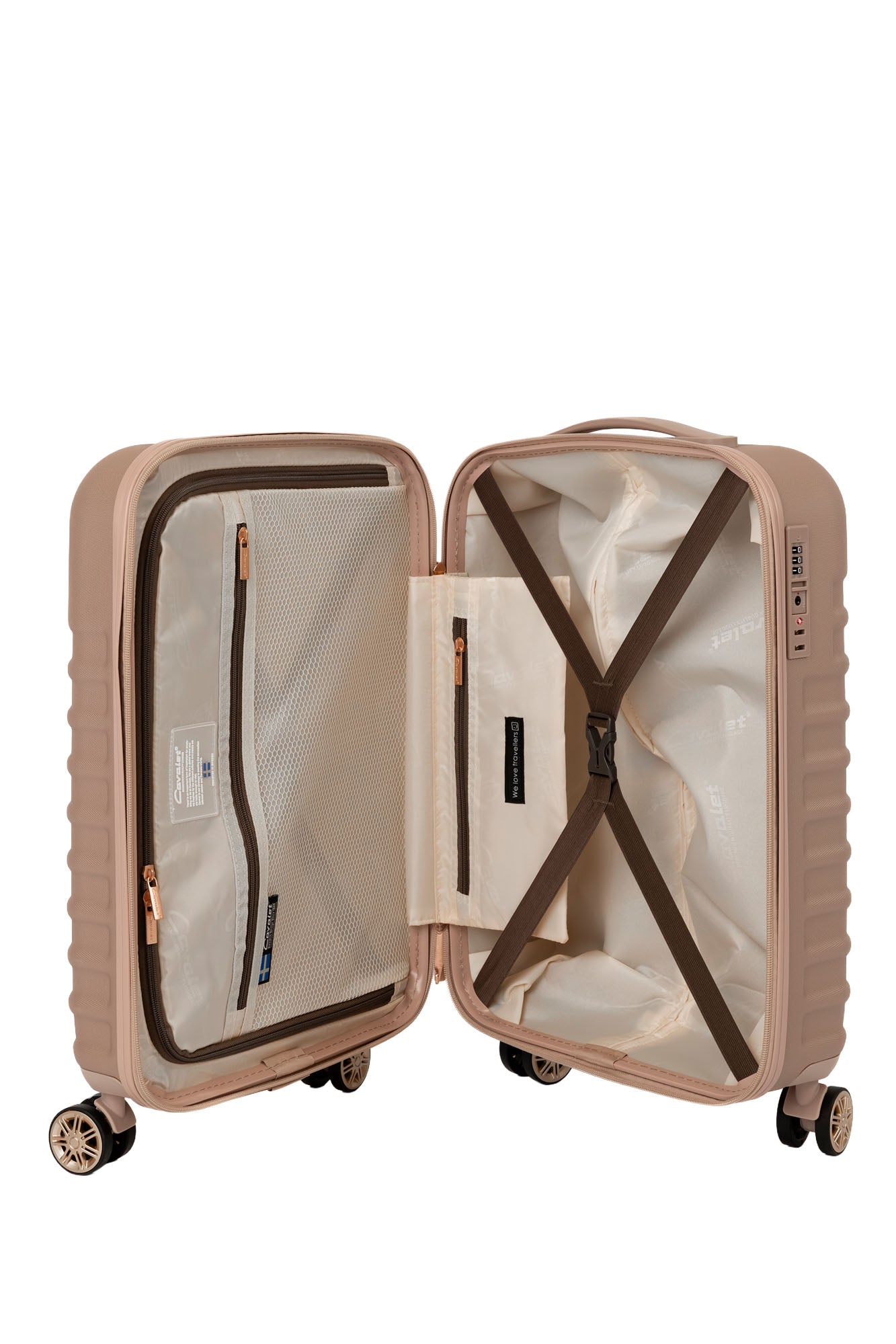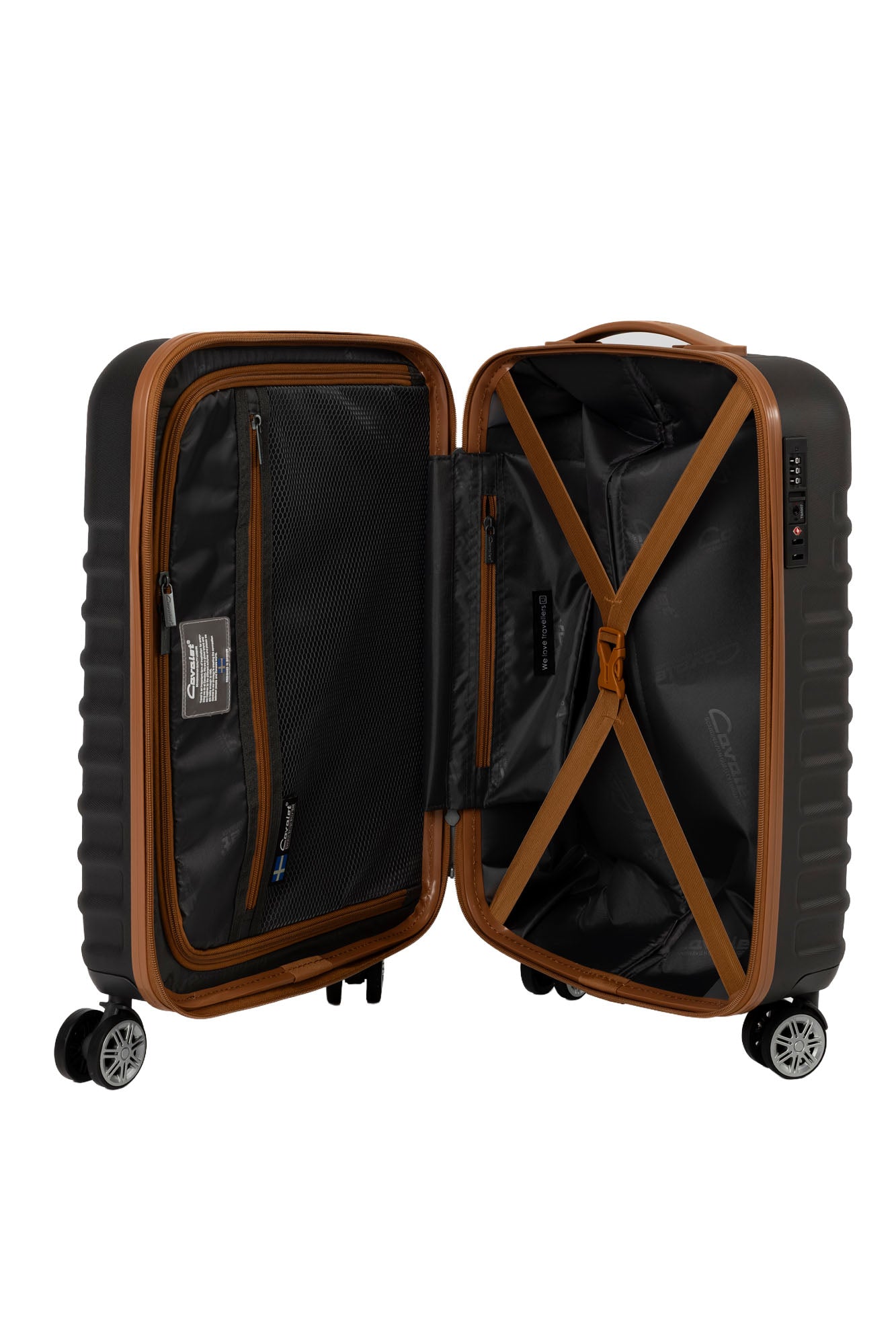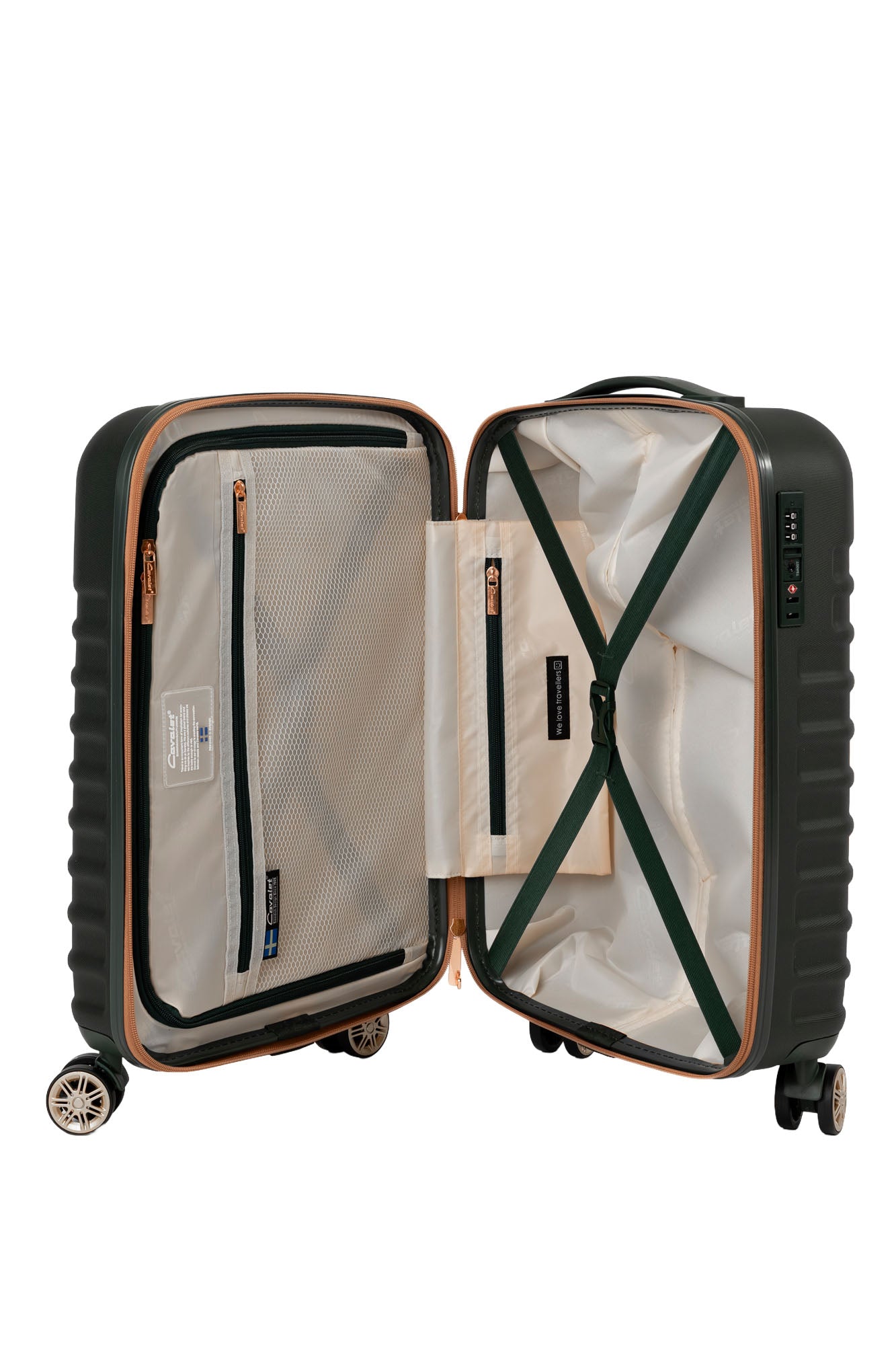 En inredning som följer väskans yttre färgkombinationer. Detaljer som nätficka och fack för småprylar. Avdelare och packband där du placerar dina kläder som ligger säkert på plats. Helt integrerat teleskophandtag. Fast TSA-lås som är inbyggt.