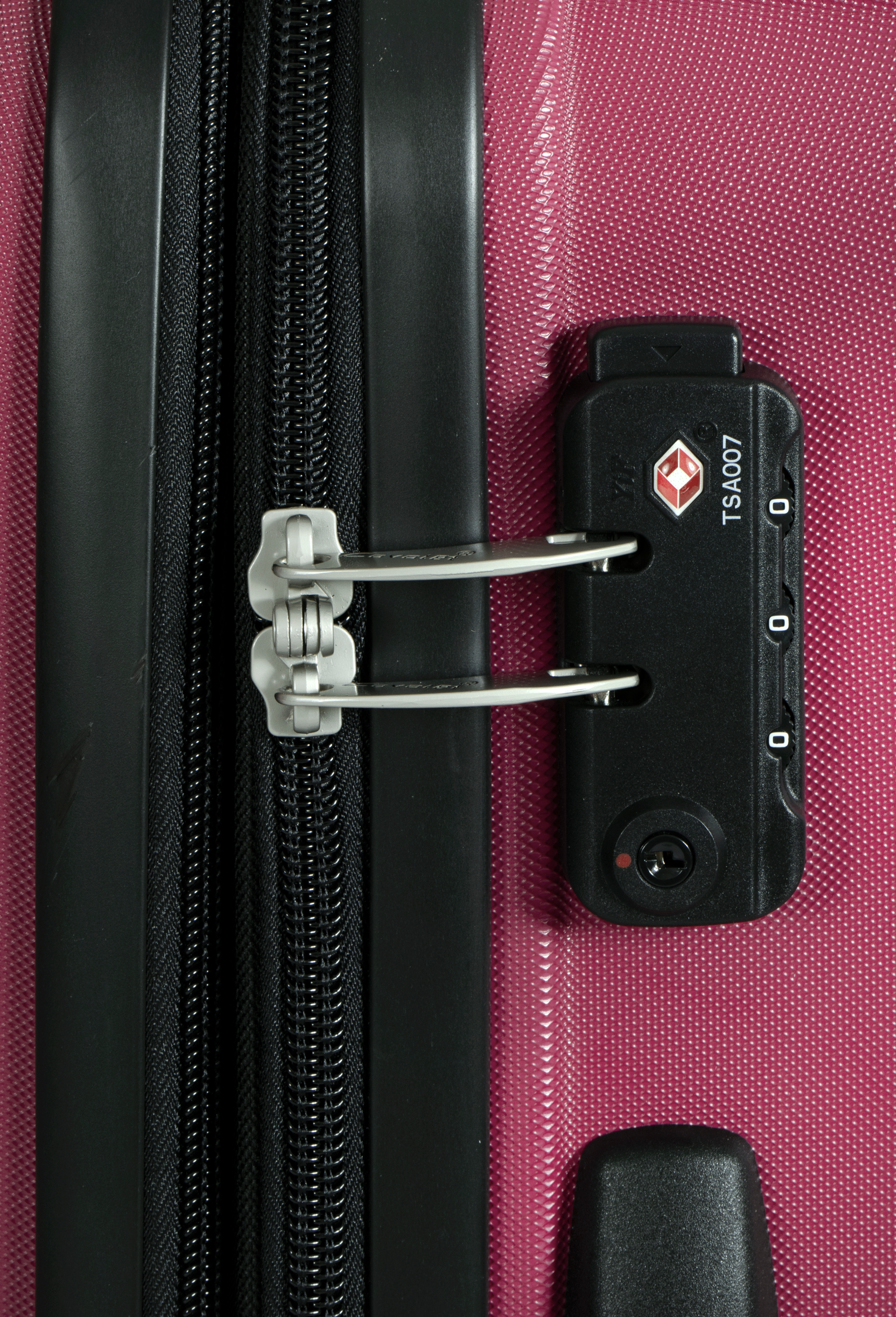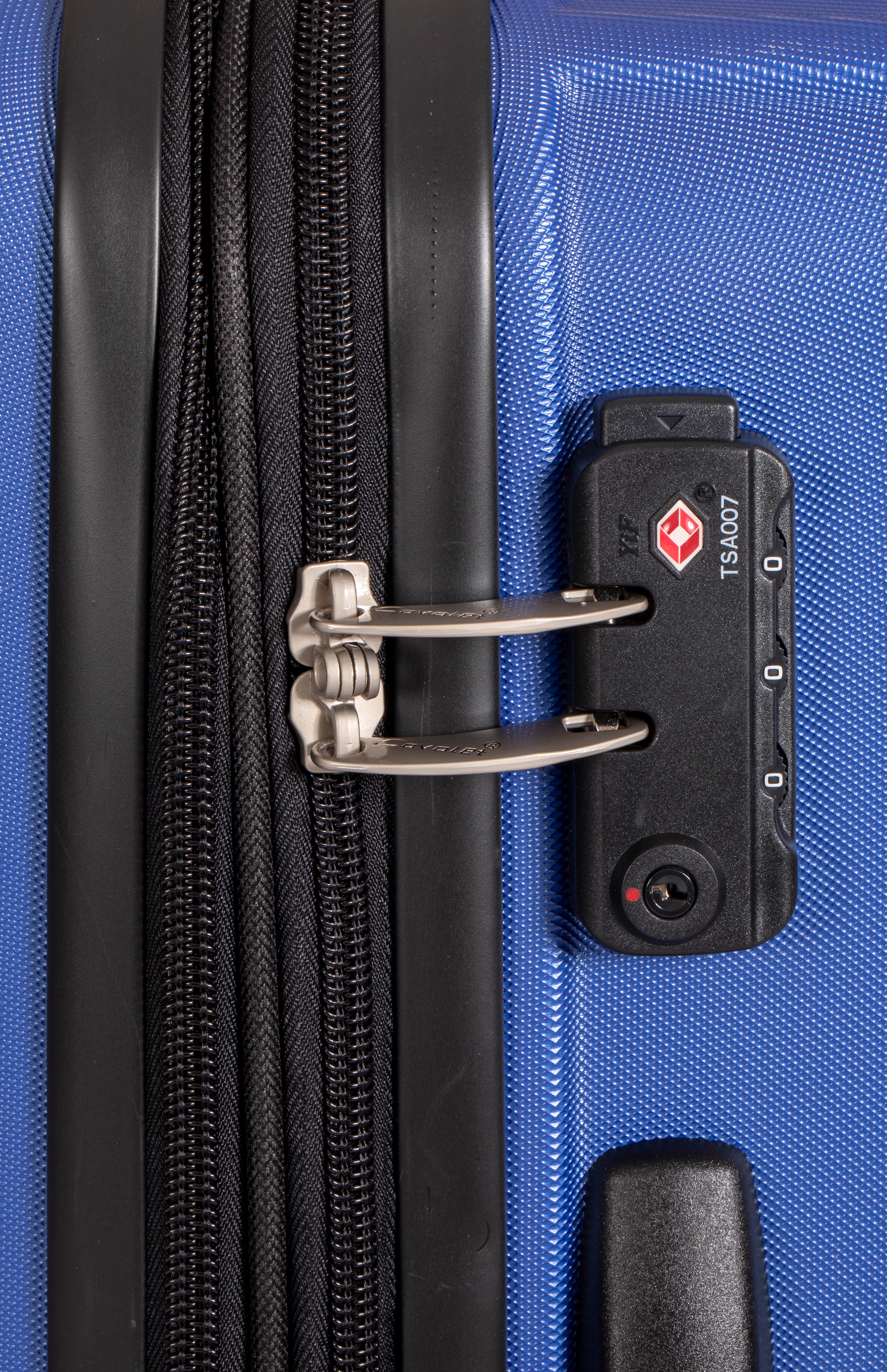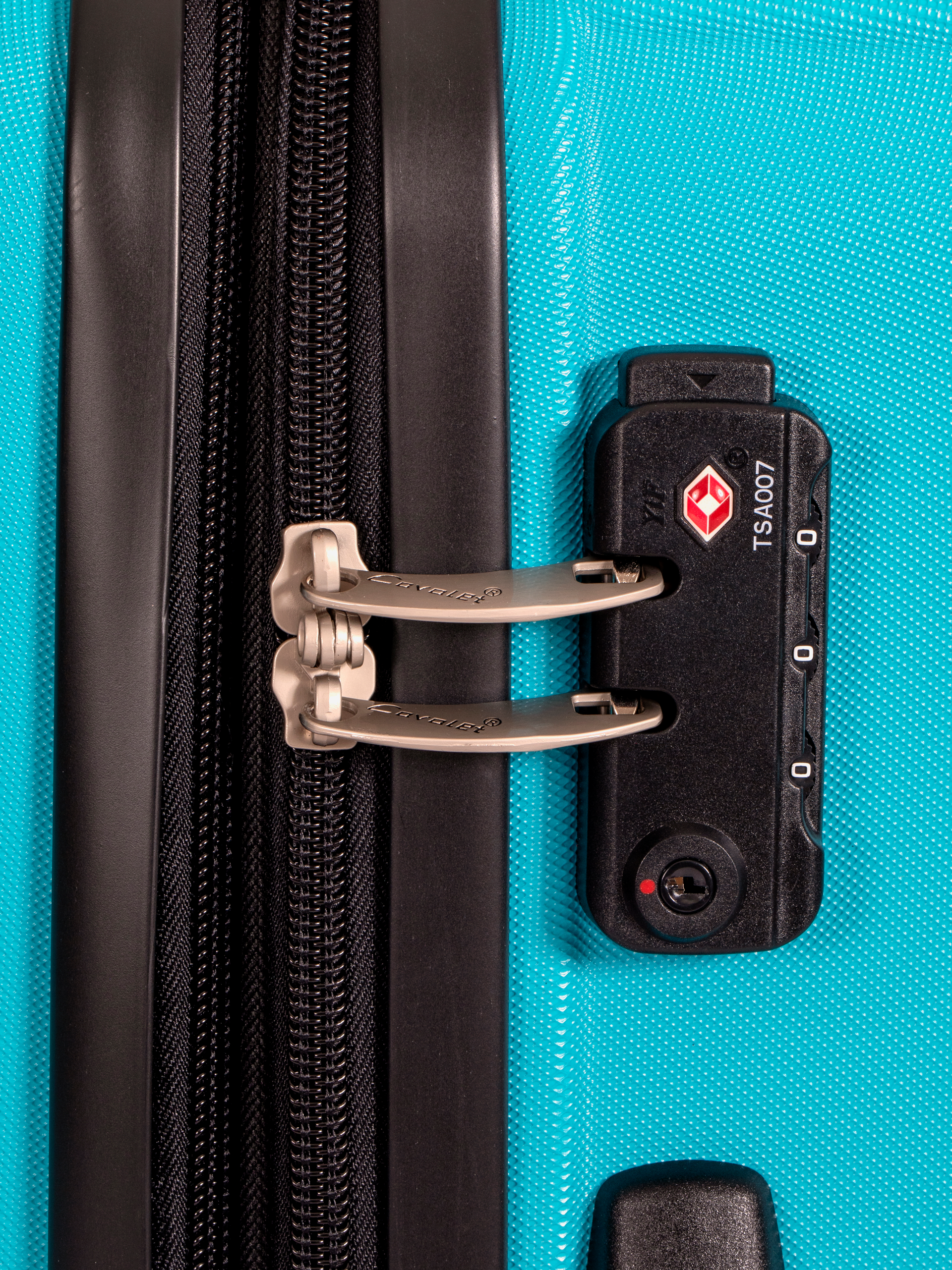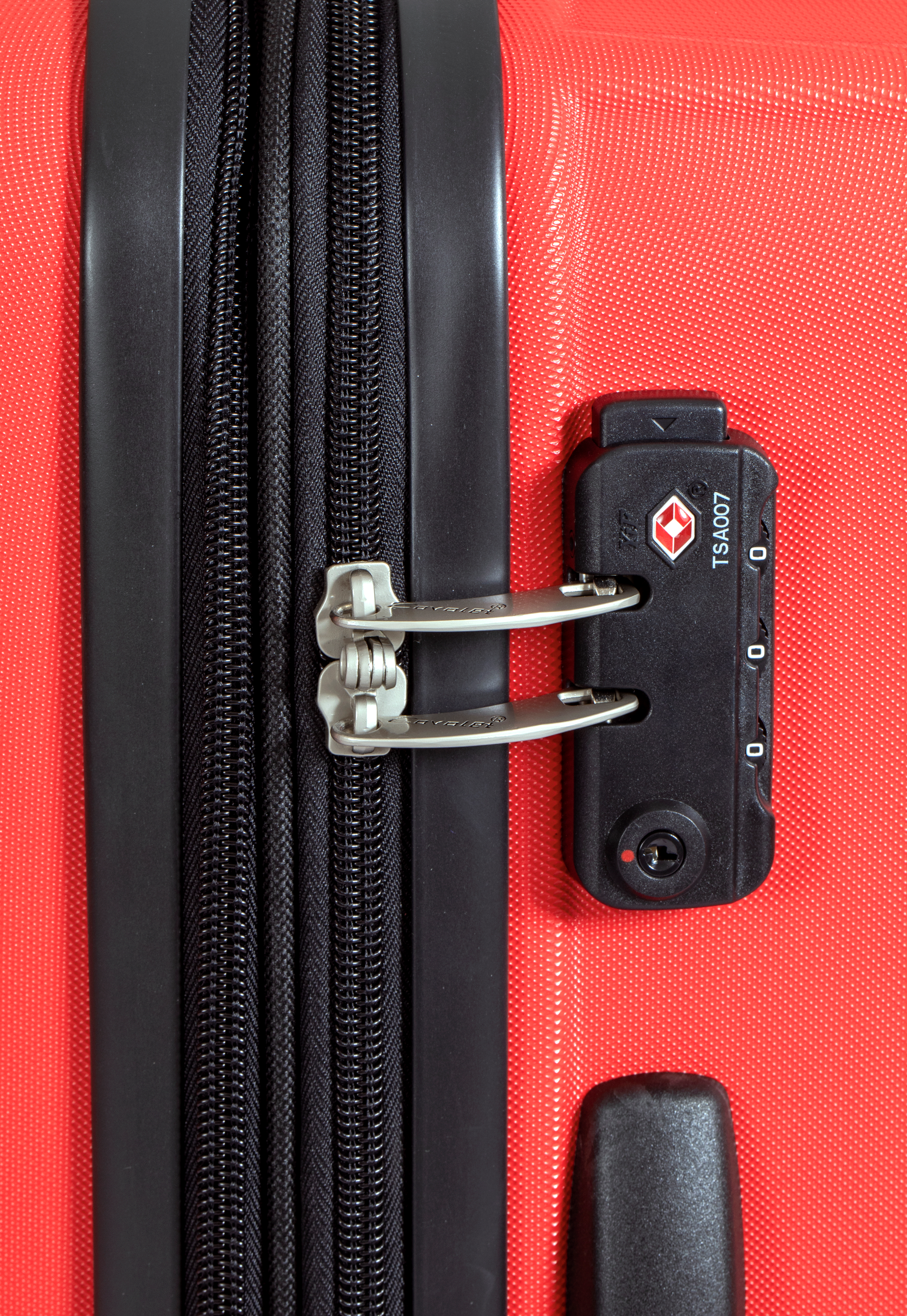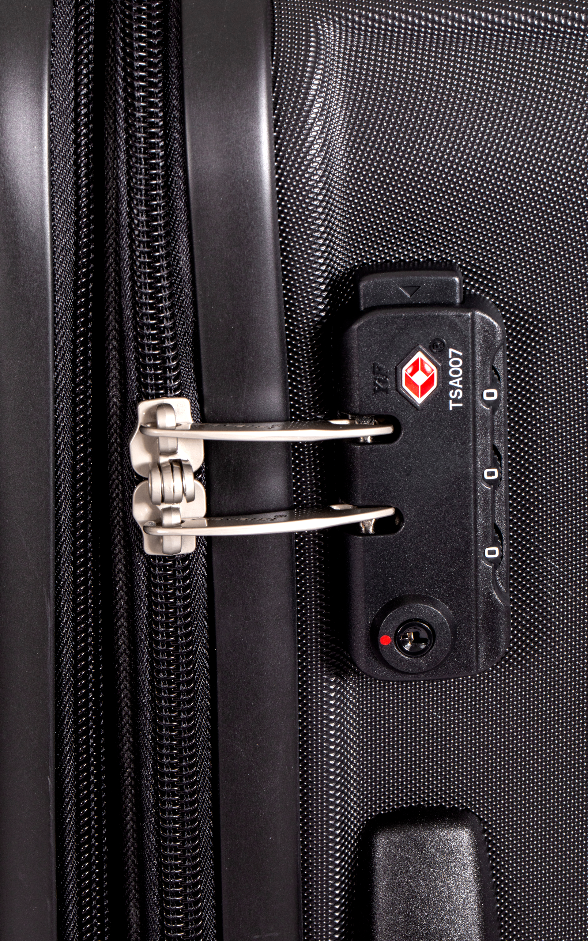 | Lås | Fast, infällt TSA-lås, tresiffrig kombination |