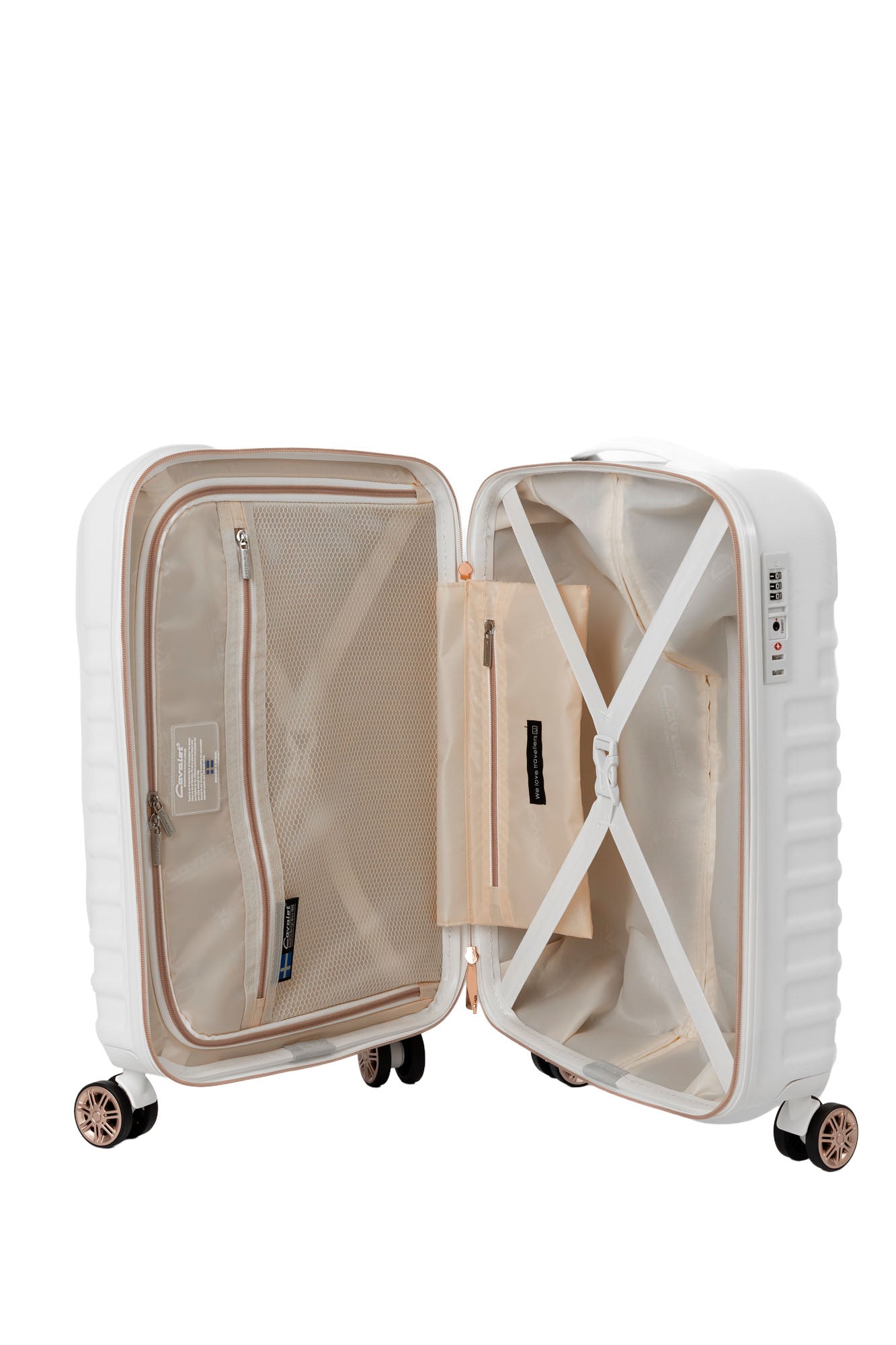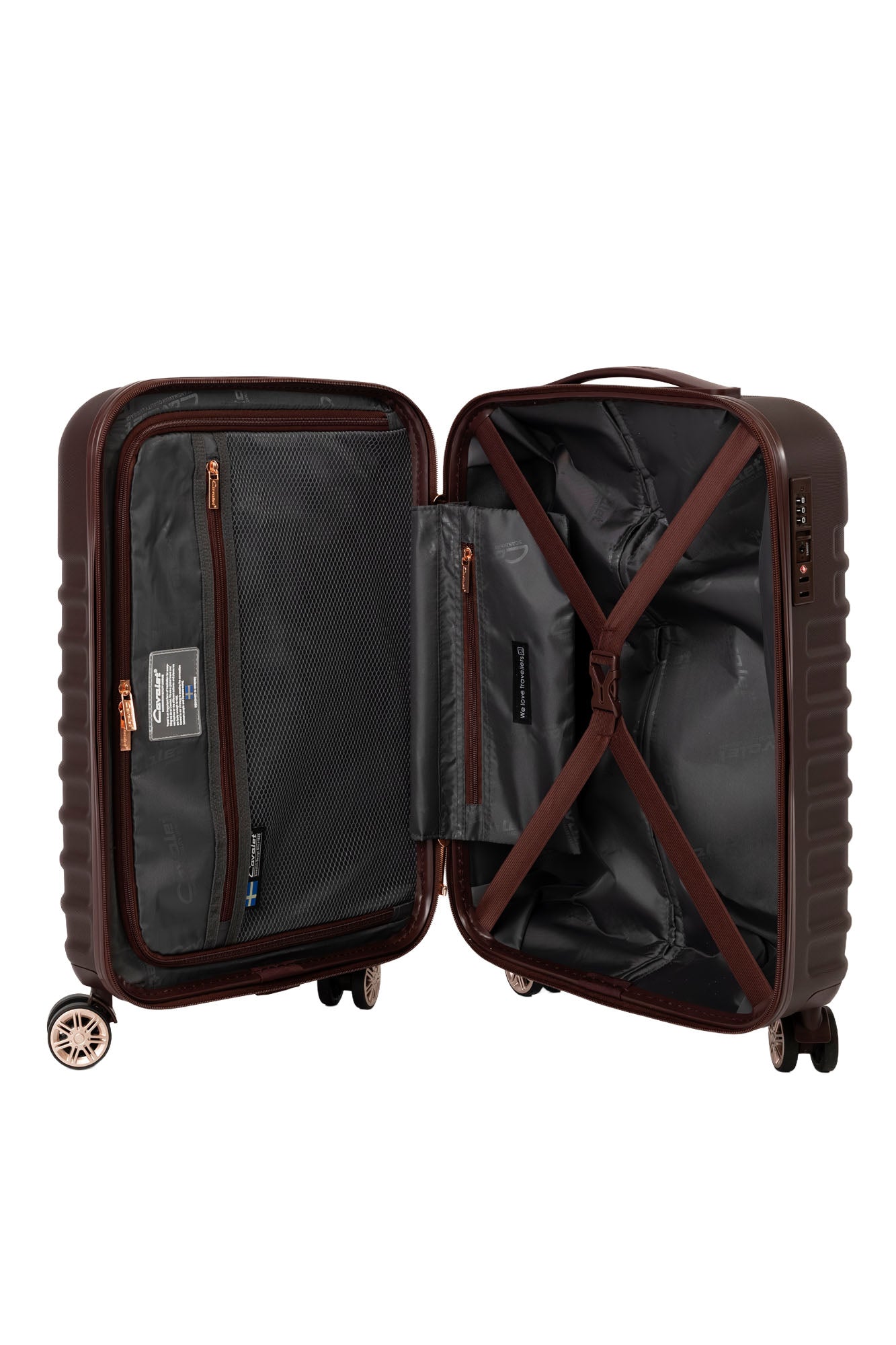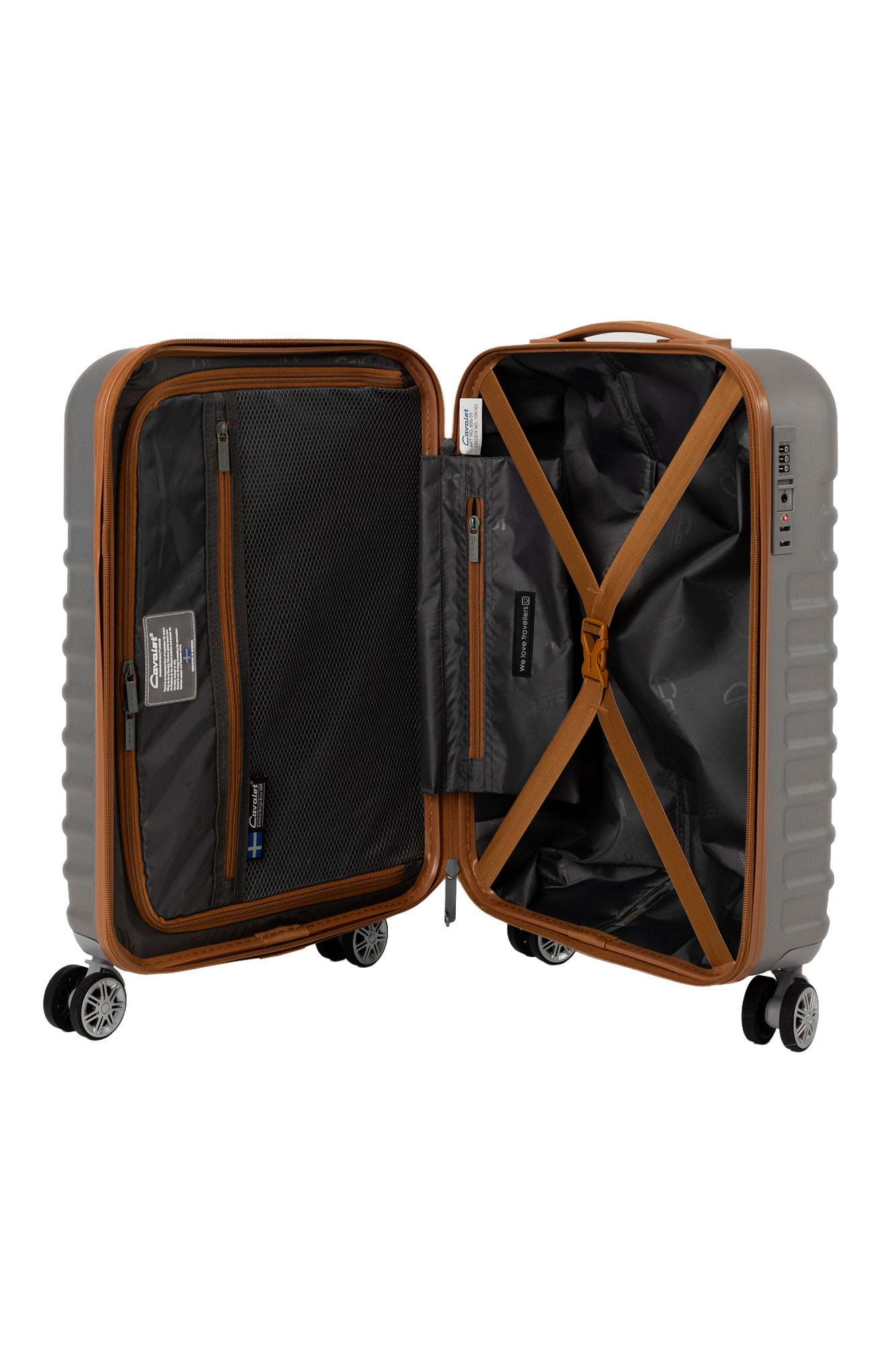 En inredning som följer väskans yttre färgkombinationer. Detaljer som nätficka och fack för småprylar. Avdelare och packband där du placerar dina kläder som ligger säkert på plats. Helt integrerat teleskophandtag. Fast TSA-lås som är inbyggt.