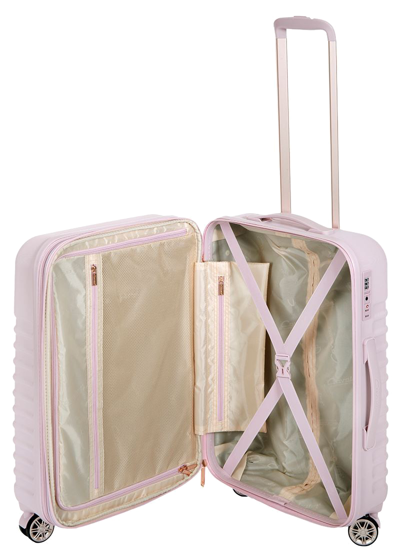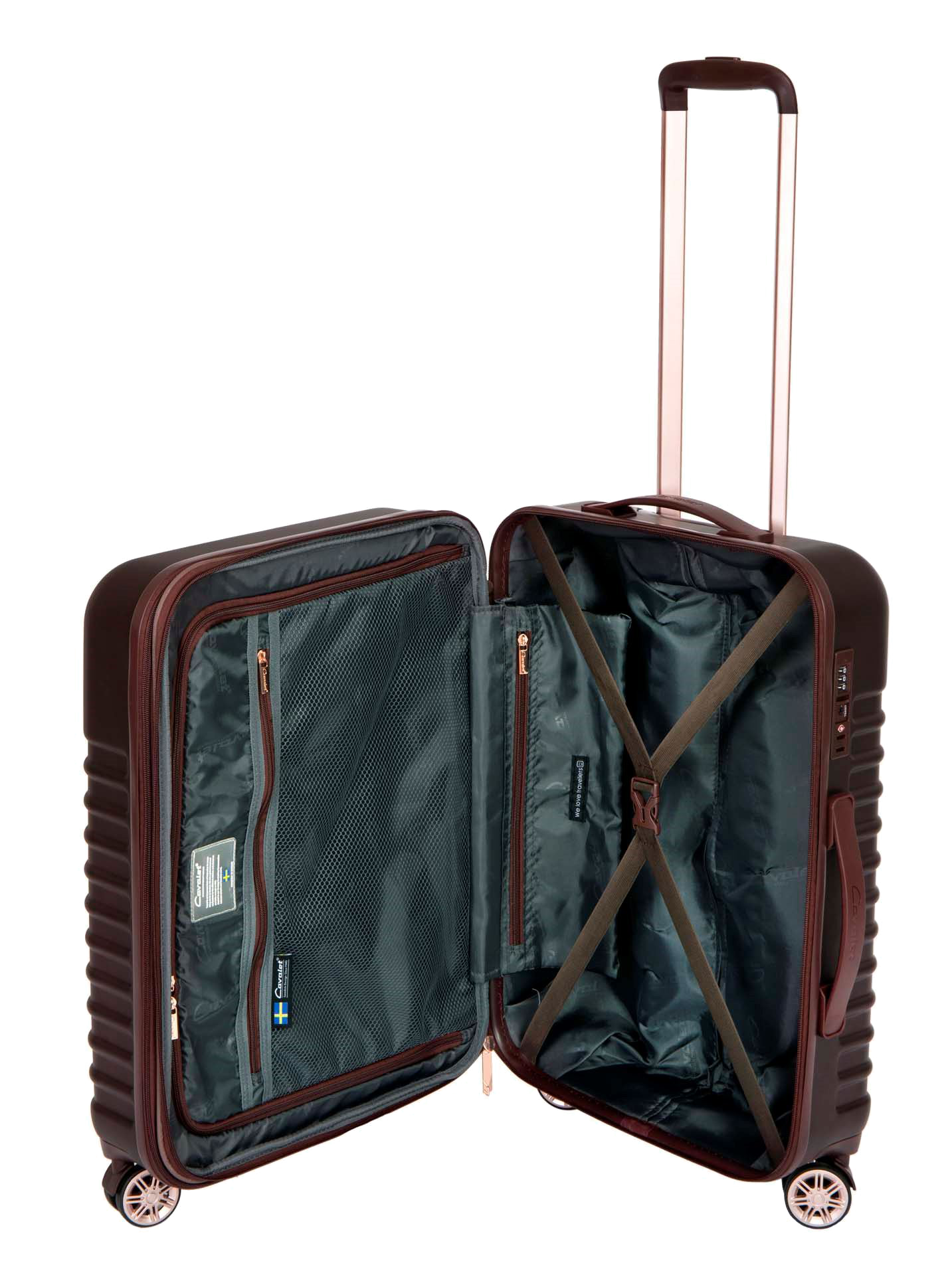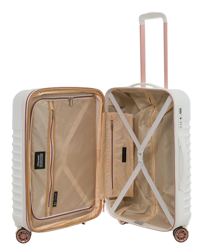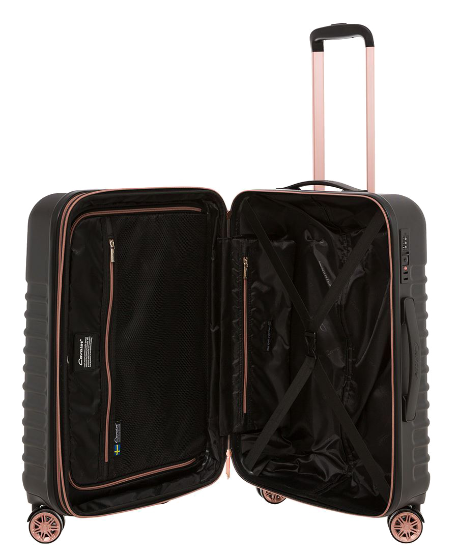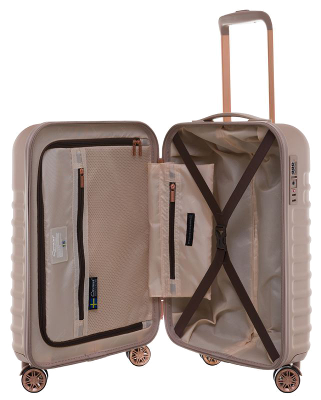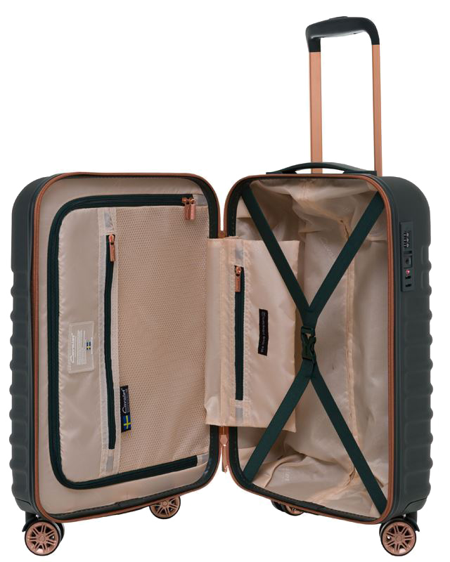 En inredning som följer väskans yttre färgkombinationer. Detaljer som nätficka och fack för småprylar. Avdelare och packband där du placerar dina kläder som ligger säkert på plats. Helt integrerat teleskophandtag. Fast TSA-lås som är inbyggt.
